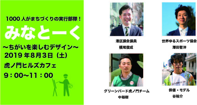 港区に住む人、働く人、学ぶ人、好きな人、みんなで港区をもっとよくする政策・企画を考え、実行するこのプロジェクト。今回からは、グリーンバード虎ノ門チームリーダーで森ビル株式会社の中裕樹さんと2人体制で運営することになりました。