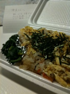 その7:夕ご飯に、けいすけがいつもお世話になっている港区の方か、らちらし寿司の差し入れをいただきました。しかも温かい手紙付き!おいしかった〜。