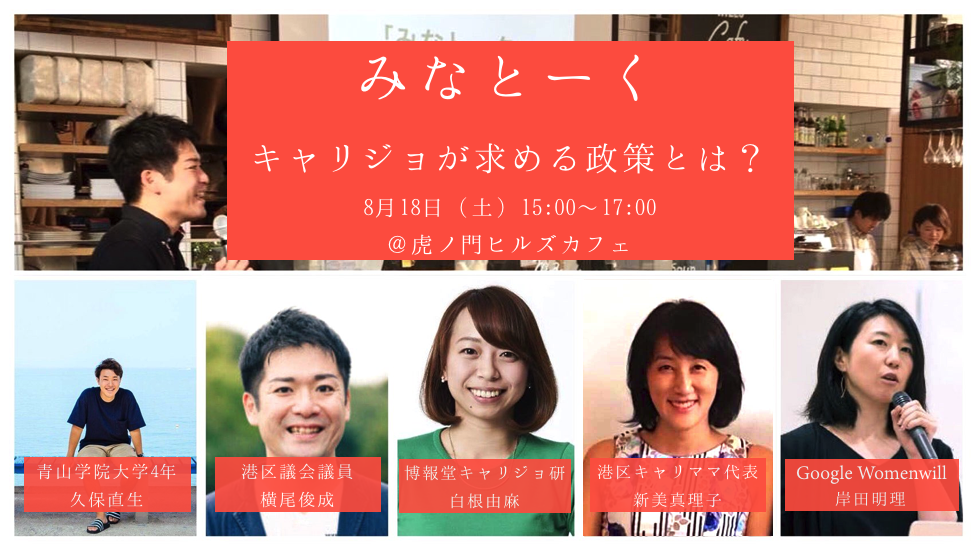 港区に住む人・働く人・学ぶ人・好きな人みんなで政策をつくる「みなとーく」。次回のテーマは、「キャリジョが求める政策とは?」です。