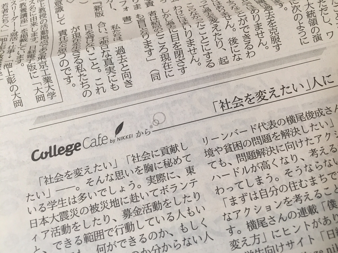現在、「日経カレッジカフェ」という日経新聞の電子版で「僕ら流・社会の変え方」という連載コーナーを持たせていただいています。