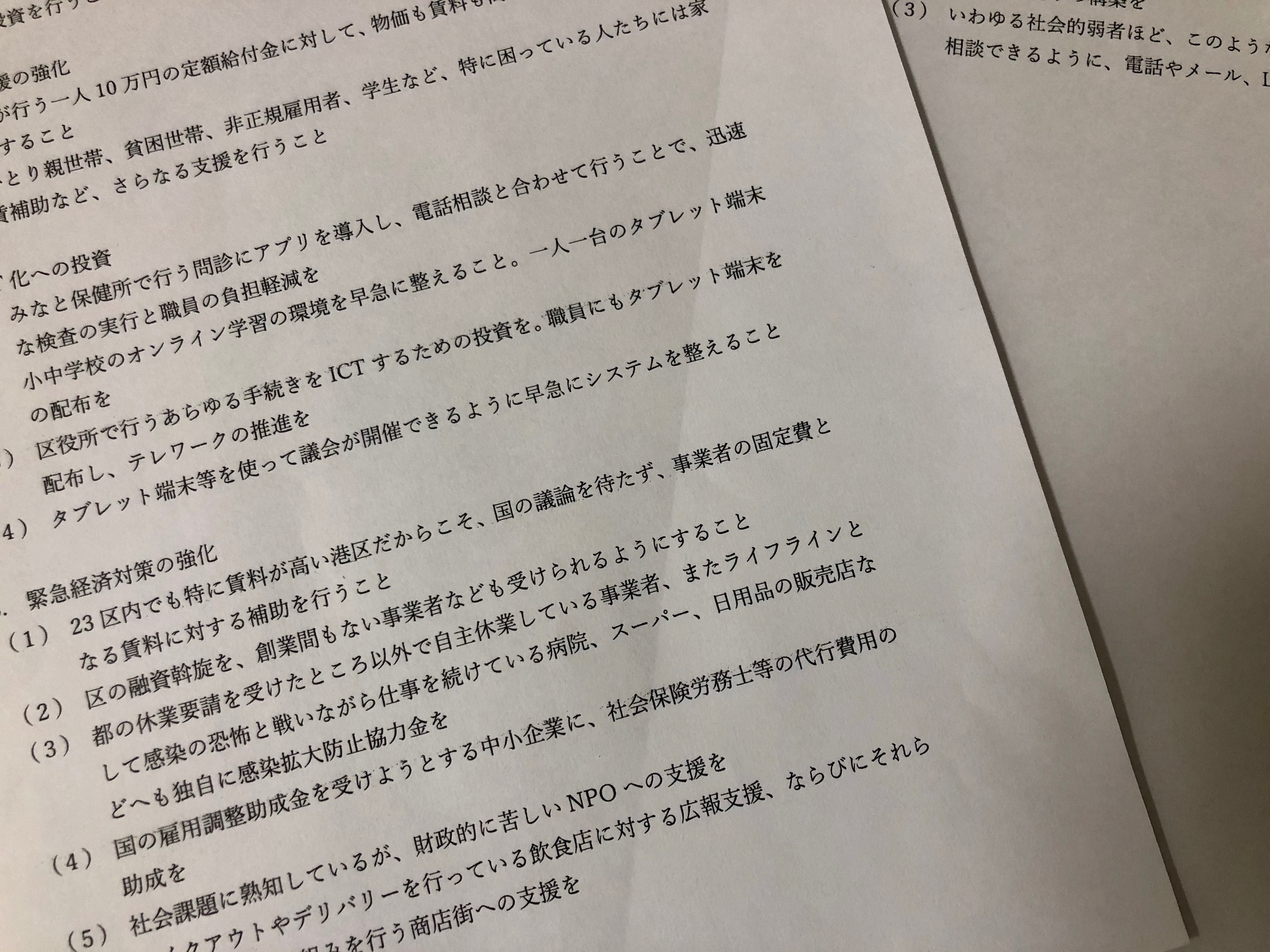 港区には、財政調整基金が523億円あります。これを積極的に取り崩して、生活支援、緊急経済対策等に港区独自の支援を行うこと。また、行政手続きや子どもの学習支援を含め、あらゆることをICT化するための投資を行うことを提案いたしました。