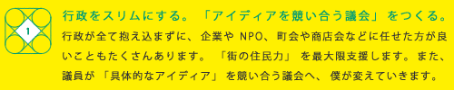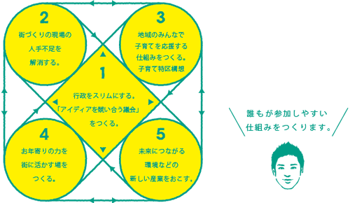 何のしがらみのない新人という立場で、予算の使い方や事業主体、事業のあり方を検証するプロジェクトチームを立ち上げます。企業に勤めていた者としての目で、行政、企業、NPO、どこがその事業をやるのが最も効率が良いのかを考え、事業主体を行政から民間に大胆に移していきたいと思います。