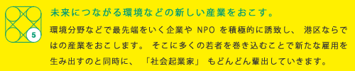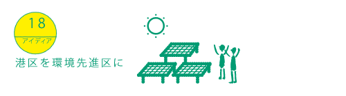 港区は環境に配慮した様々な取り組みを行っていますが、それをビジネスにつなげ、一大産業に育てることに挑戦したいと思います。既に始まっている屋上緑化に対する助成を推進するとともに、ソーラーパネルなどの新しいシステムを取り入れます。そうすることで、「区内の電力を区内でまかなう」ことにチャレンジするだけでなく、新たな雇用も創出します。また、海外の有力なベンチャー企業を招き、日本での事業をサポートすることで、彼らの新技術を取り入れていきます。