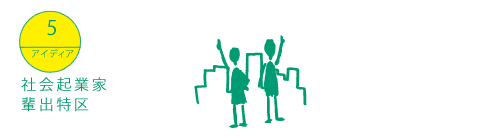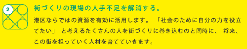 この街で働き、街づくりに関わっていこうとする起業家や学生を、街をあげて全面的にバックアップします。家賃の補助や区にある遊休地の貸し出し、シェアハウスなどの補助に加えて、将来的には税などの優遇施策も検討したいと思います。若い世代にコミュニティ参加を促しつつ、「社会起業家」がたくさん生まれ、育つ街:「社会起業家版シリコンバレー」をつくります。