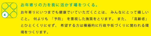 いわゆる団塊の世代を中心とした、健康で、かつ社会と積極的に関わる意欲をもった方々のこと。仕事をしたり、NPOなどでボランティアをしたり、社会の中でまだまだやれる方々に、いかに街づくりに関わっていただくかが、行政の知恵の使いどころ。僕はずっとおじいちゃん子でしたが、祖父を通じて、近所のおじさんや町内会の方々から、街の成り立ちや戦争のことなどたくさんのことを学んだ記憶があります。コミュニティがどんどん希薄化している時代ですが、新しい形でそうした温かい関係をつくっていくことができたら。街の中で子どももお年寄りも気軽に交流できたり、そこから新しいコミュニティが生まれたりしたら素敵ですよね。