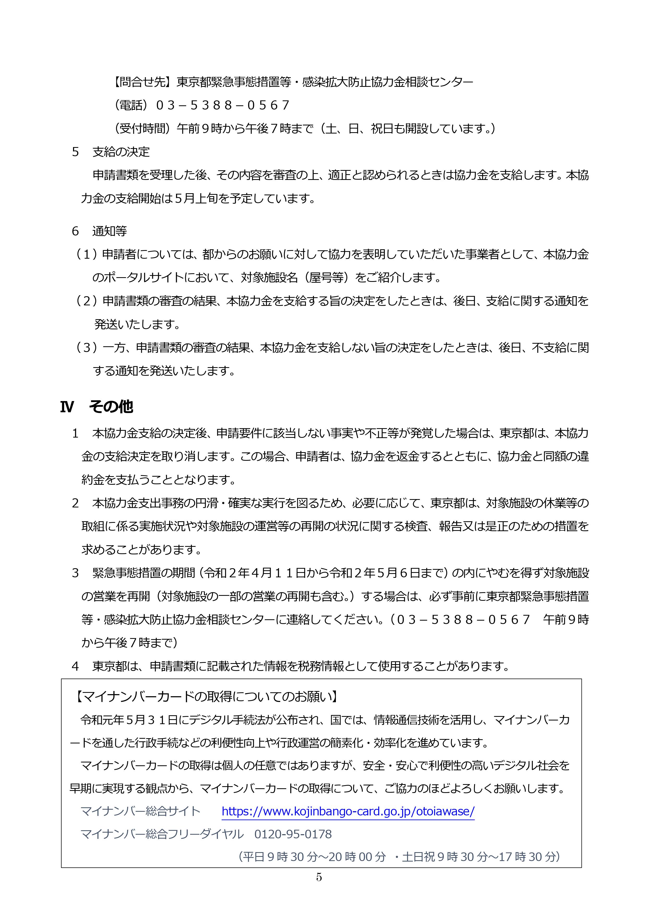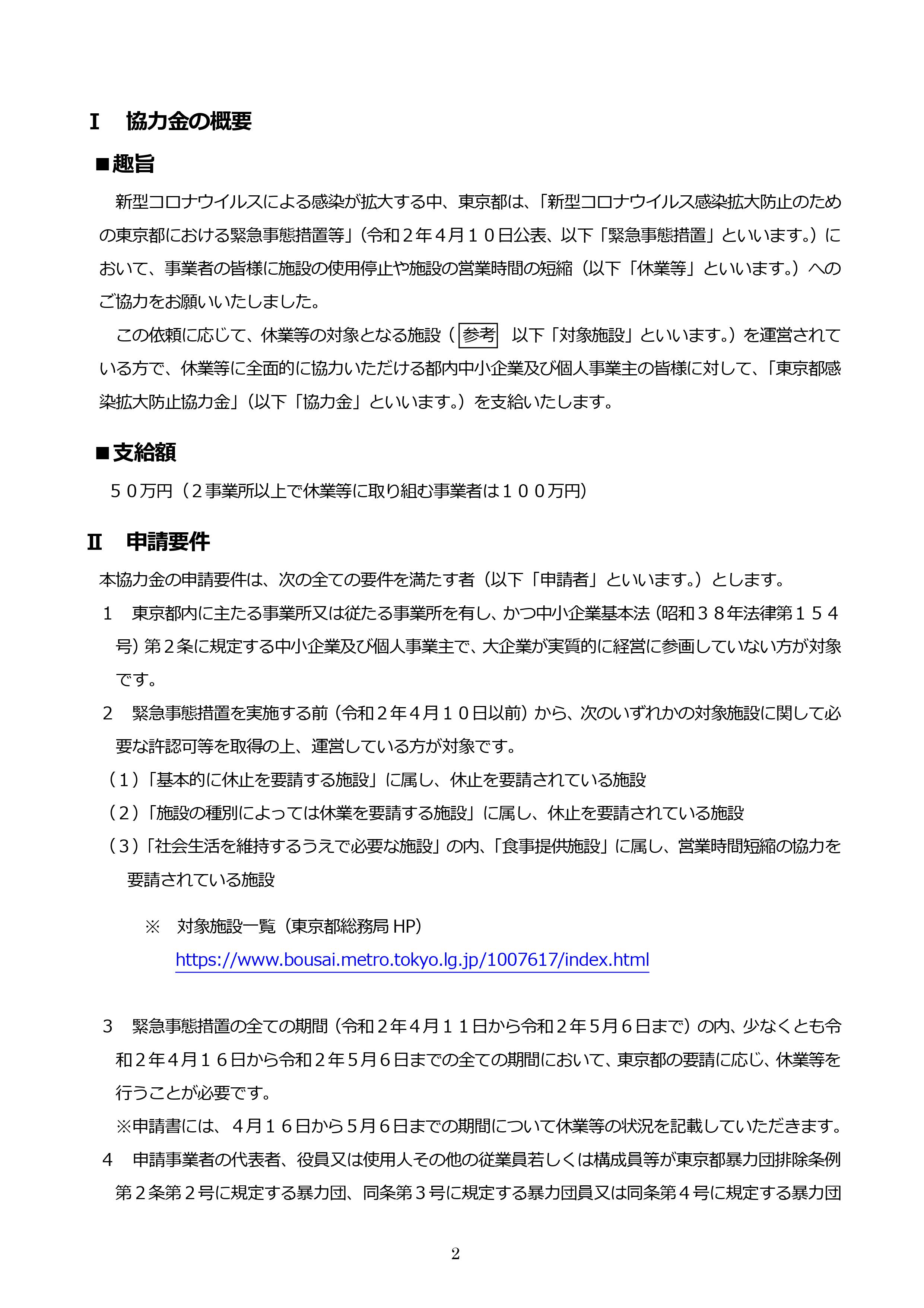「東京都感染拡大防止協力金」の申請は、本日から6月15日までの受付となっています。対象は、東京都内に主たる事業所または従たる事業所がある中小企業および個人事業主です。緊急事態措置のうち、4月16日から5月6日までのすべての期間において、東京都の休業要請に応じ、休業等を行うことが支給の条件となっています。オンライン、郵送、持参での申請です。申請に必要な書類等については、都のガイドラインを添付いたしますので、ご参照ください。