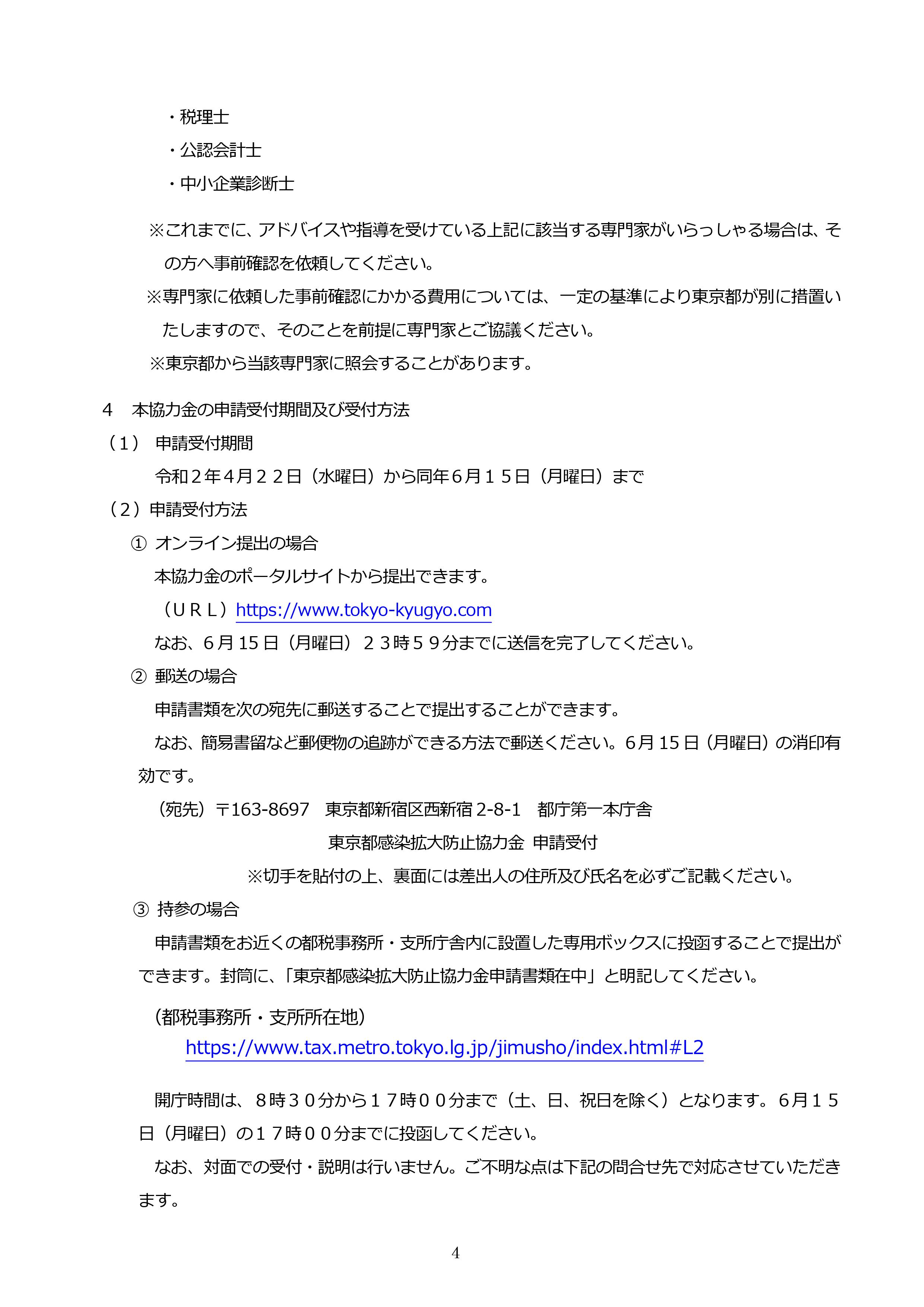 税理士、公認会計士などの専門家による事前の書類のチェックを受けると、確認作業と支給(5月上旬より開始予定)が早くなるようですので、いつもお願いしている方がいれば、その方にお願いするのがよさそうですね。(専門家への事前確認にかかった費用については、一定の基準により、都が別に措置するそうです。)