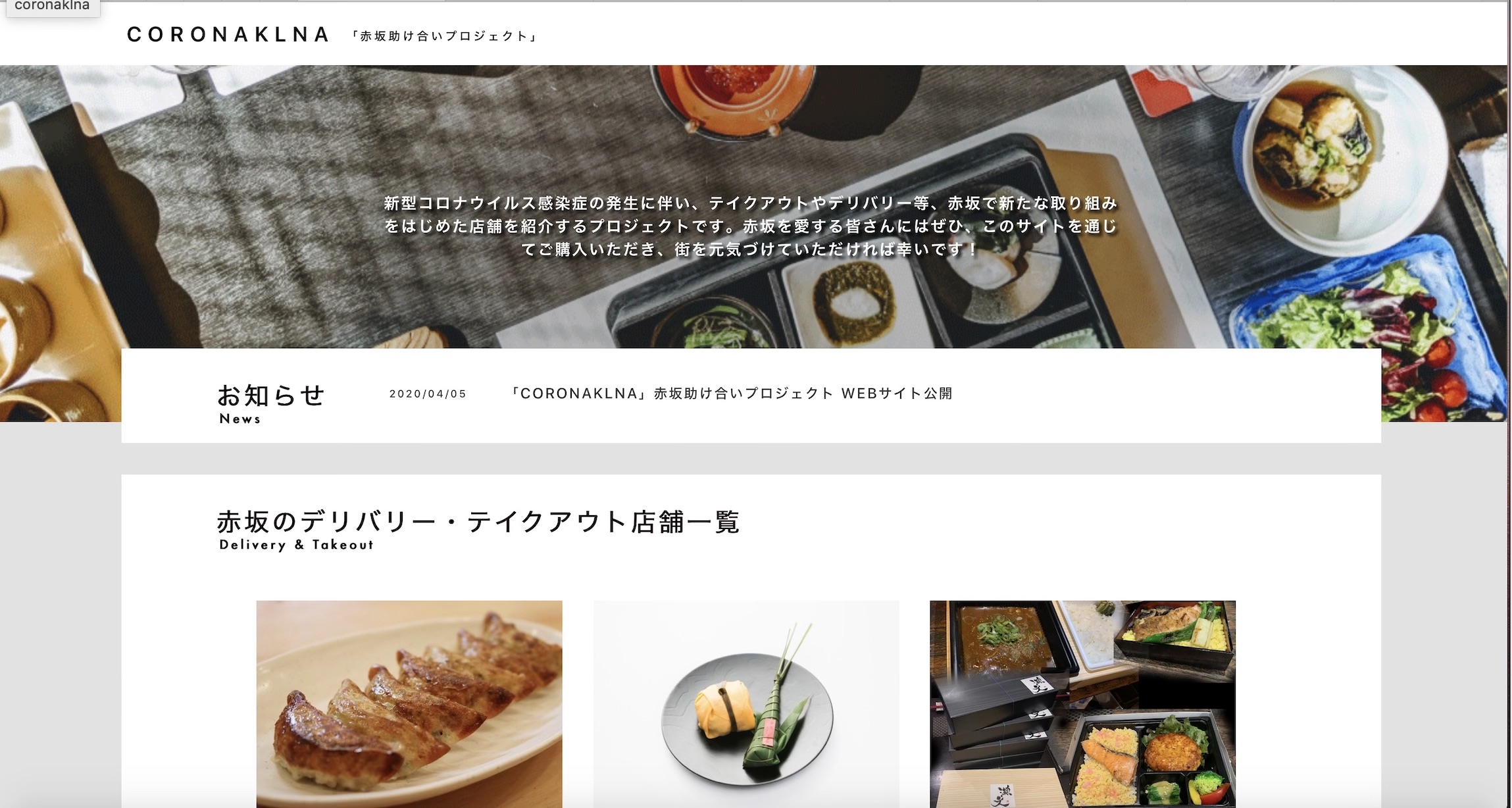 赤坂でデリバリーやテイクアウトをはじめた店舗を応援するサイト「CORONAKLNA 赤坂助け合いプロジェクト」が完成しました!(横尾事務所のサポーターもサイトの制作に携わってくれました。)