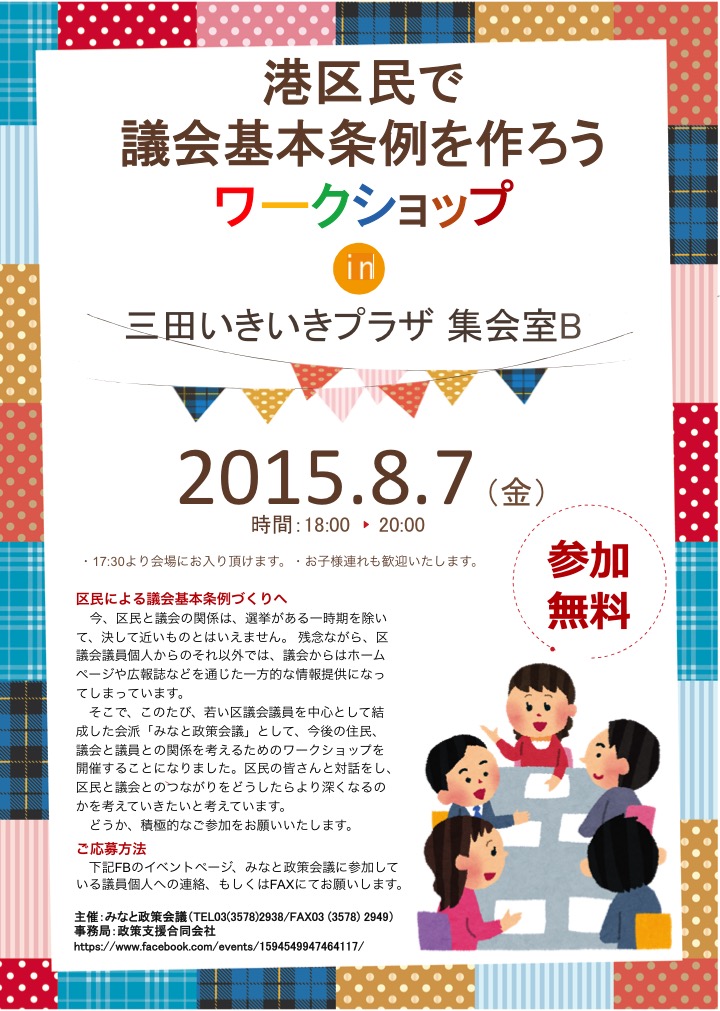 そこで、この度、港区でもこの「議会基本条例」を制定するべく、私の所属する会派「みなと政策会議」主催で区民のみなさんとのワークショップを企画致しました。当日は、「議会基本条例」をめぐるこれまでの動きや先進事例をご紹介しつつ、「どうしたら議会と区民の距離が縮まるのか」、「若者や新住民の方の参画を得るにはどうすればいいのか」などについて皆さんとディスカッションしたいと思っています。