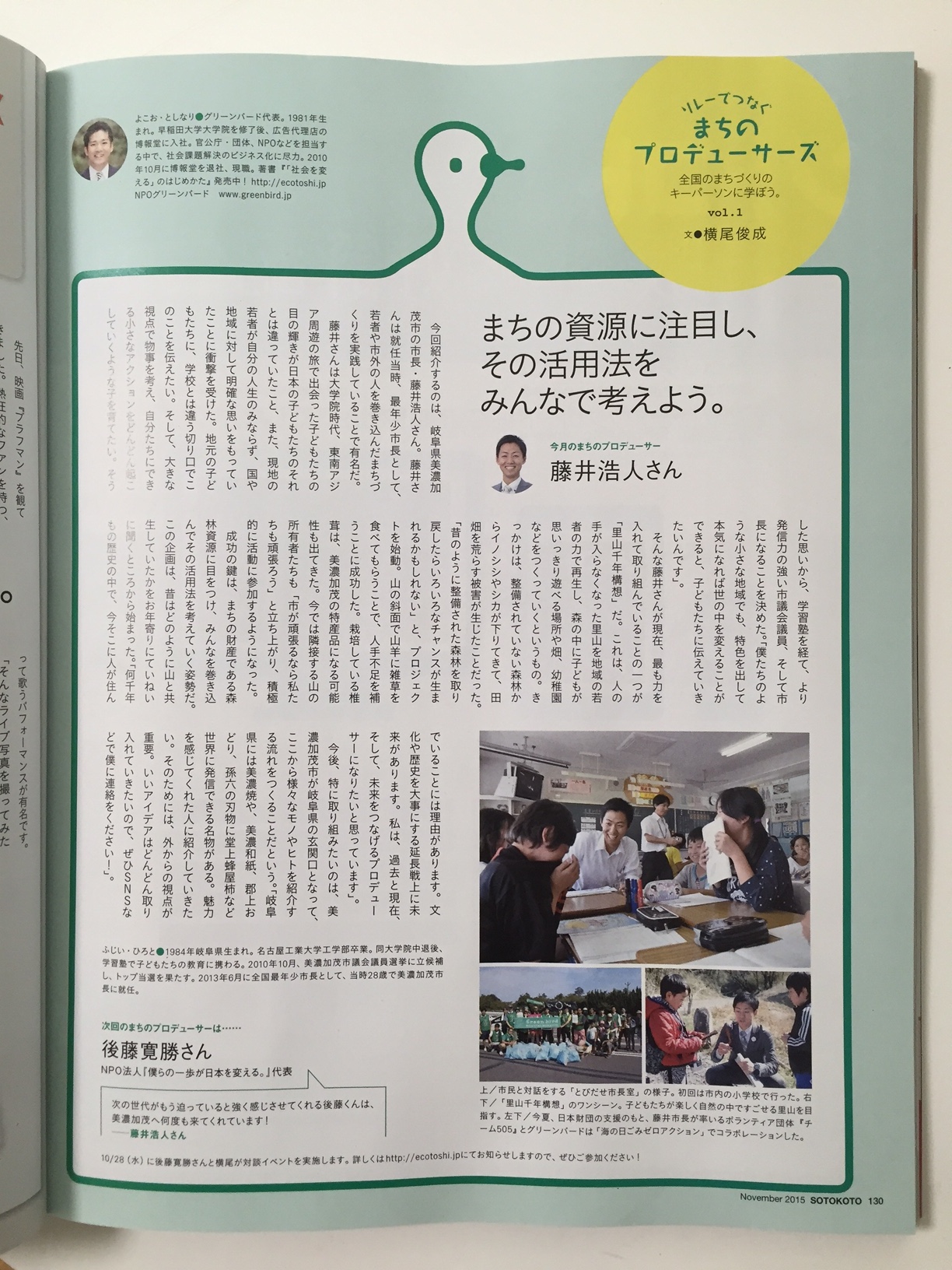 その記念すべき第一回は、岐阜県美濃加茂市の藤井浩人市長!具体的で、気持ちの入ったプランの数々に感心すること間違いナシです。まだの方は、ぜひこれを機に、月刊『ソトコト』を読んでみて下さいね。10月5日発売です。