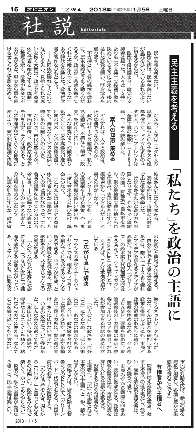 朝日新聞の社説の中に、私の政治・まちづくりの活動について取り上げていただきました。