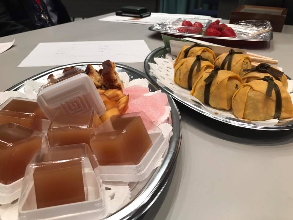 みんなで、赤坂青野さんのお菓子、有職さんの茶巾寿司、シェ・ミカワさんのケーキ、桜の香りのするビールなどを頂きました。