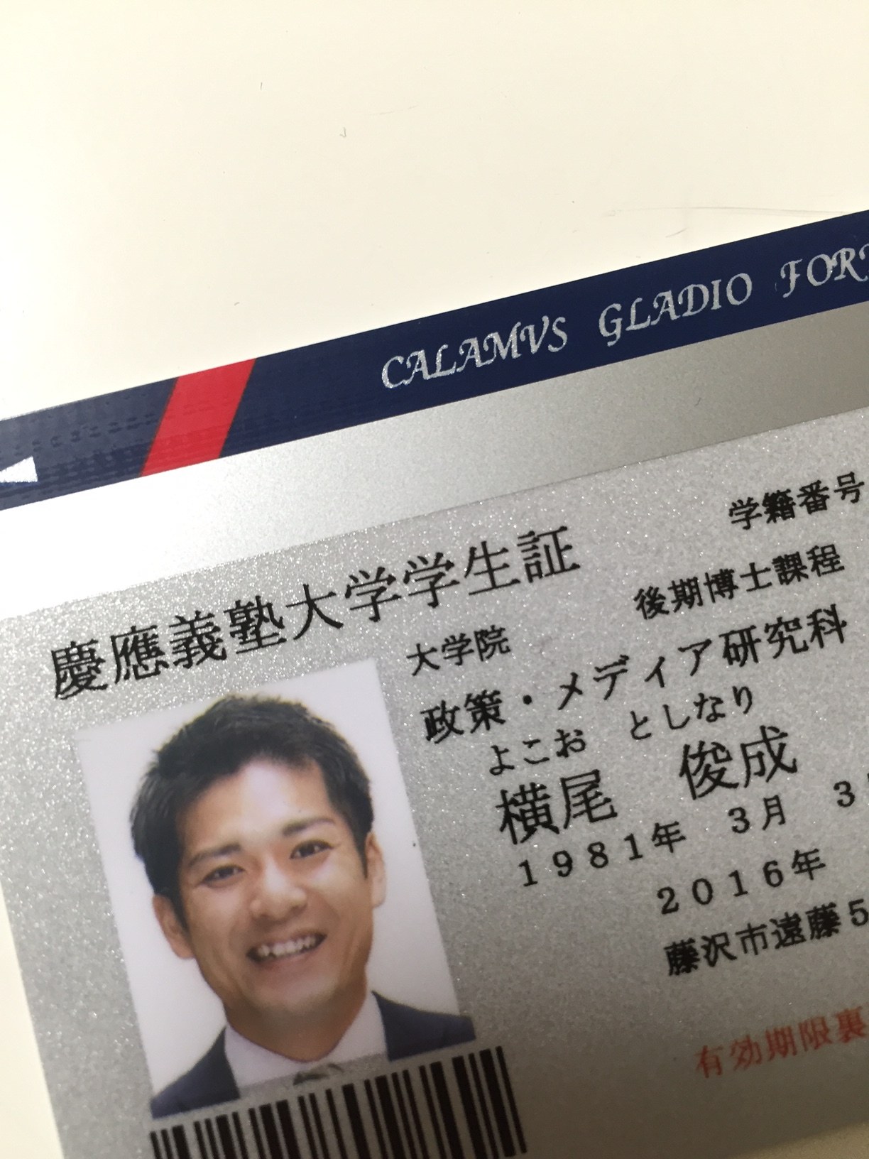 2016.04.06慶應義塾大学大学院政策・メディア研究科(博士課程)に入学しました。学生になりました!久しぶりに大学のキャンパスなる場所に来て、何だか所在ない気持ちになりました。これから平日の夜、一日だけ大学院に通い、3年で博士号の取得を目指します。政治の理論をきちんと学び、もっと自分の「武器」にできるように。企業、行政、非営利組織の3つを越えて活躍する人を「トライセクターリーダー」と言うみたいですが、そこに「大学」が加わる人はなかなかいないのでは?しばらくお酒を控えた生活を送るつもりです。その点、ご容赦下さい! SHARE THIS ARTICLE一覧へ戻る
