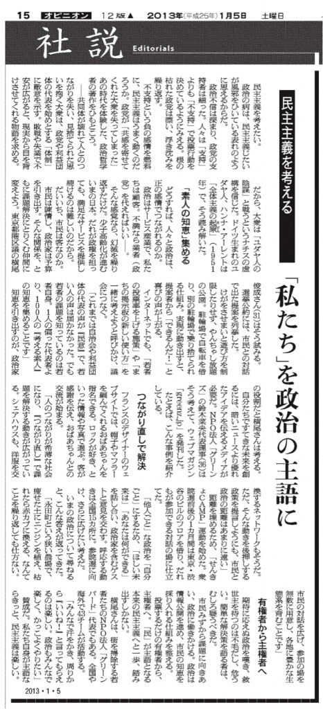 今朝(1/5)の朝日新聞の社説に取り上げていただきました!